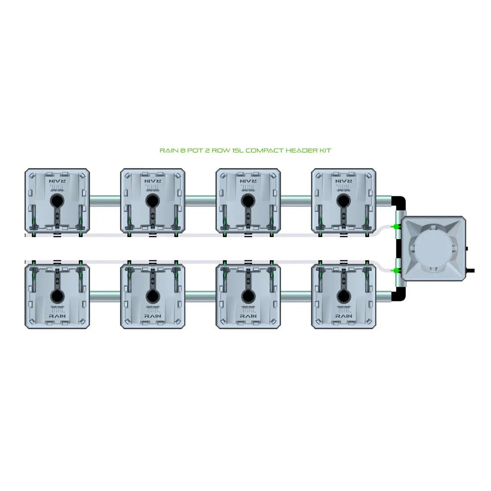 Ideal for growers who want to go beyond hobby level for more yields and flexibility without the hassles of large-scale systems, the RAIN Top-Feed 8 Pot 2 Row Kit mimics natural rainfall to ensure optimal nutrient absorption, oxygenation, and root health, while minimizing wastage. The unique design of the Rain Top-Feed System allows you to work with different growing mediums while not worrying about root rot, nutrient lockout, and salt buildup.