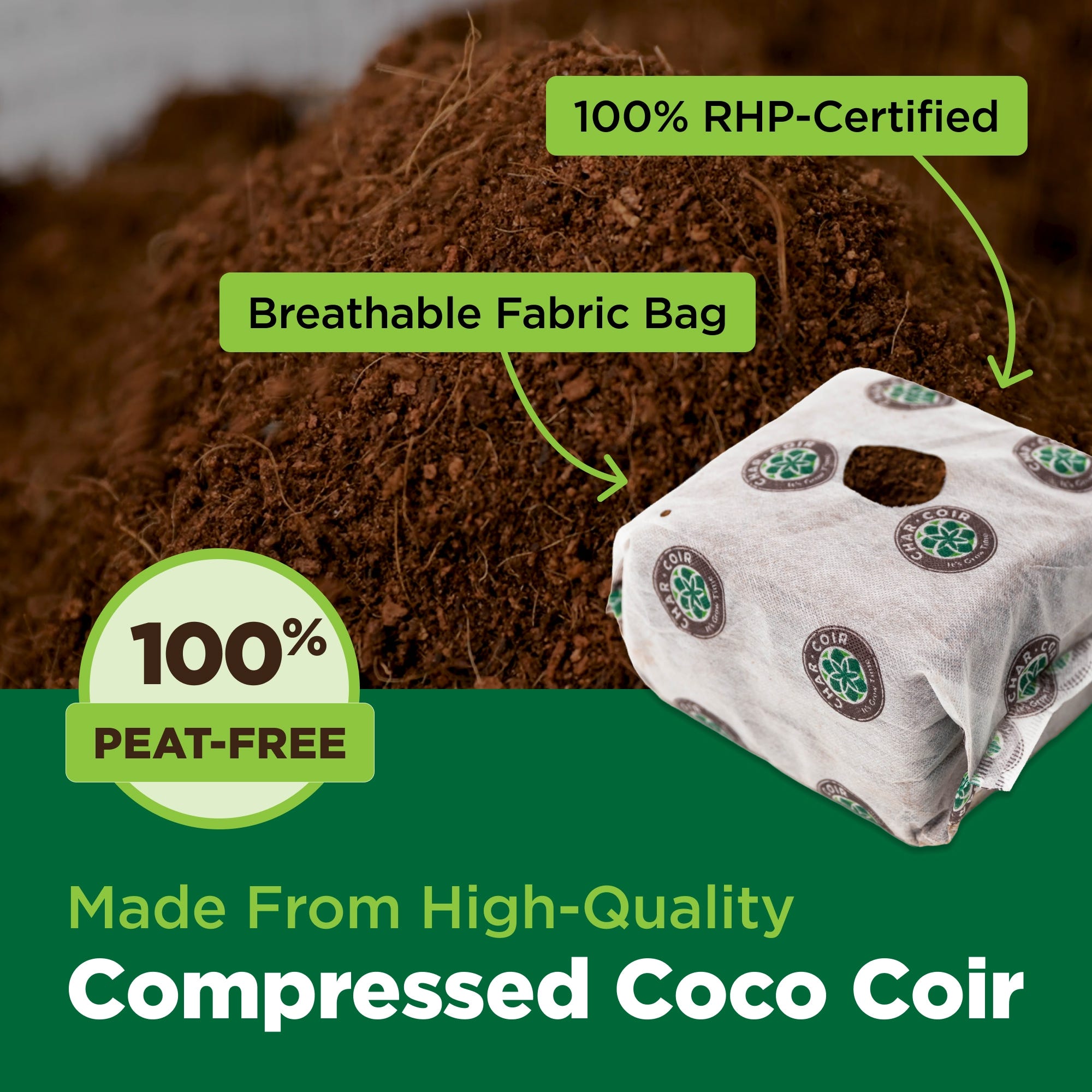 Inconsistent germination rates and weak root development during early growth stages compromise your entire crop. The Char Coir Coco Cube eliminates these risks with 100% RHP-certified
