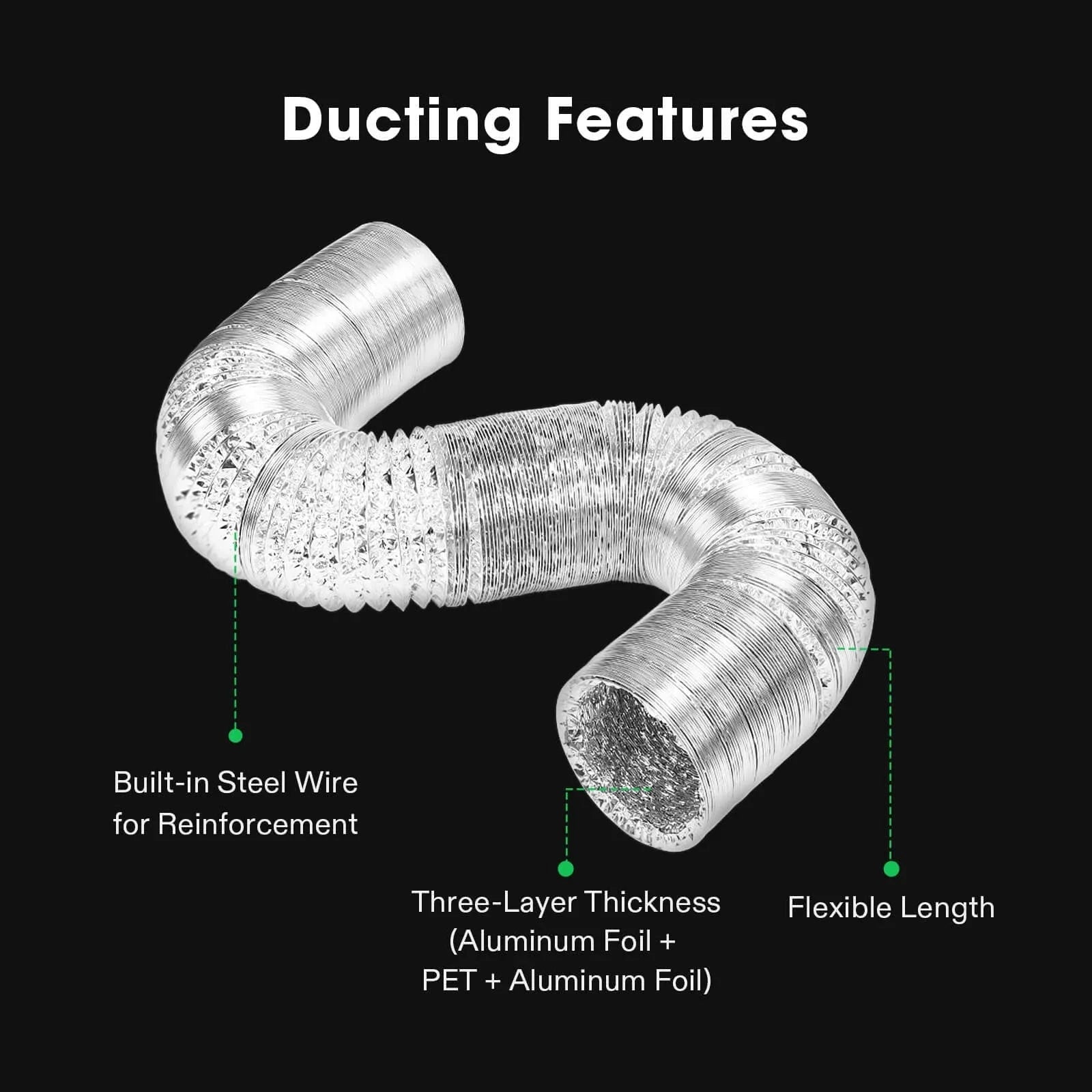- 1x 25 feet aluminum ducting with PET thermoplastic core