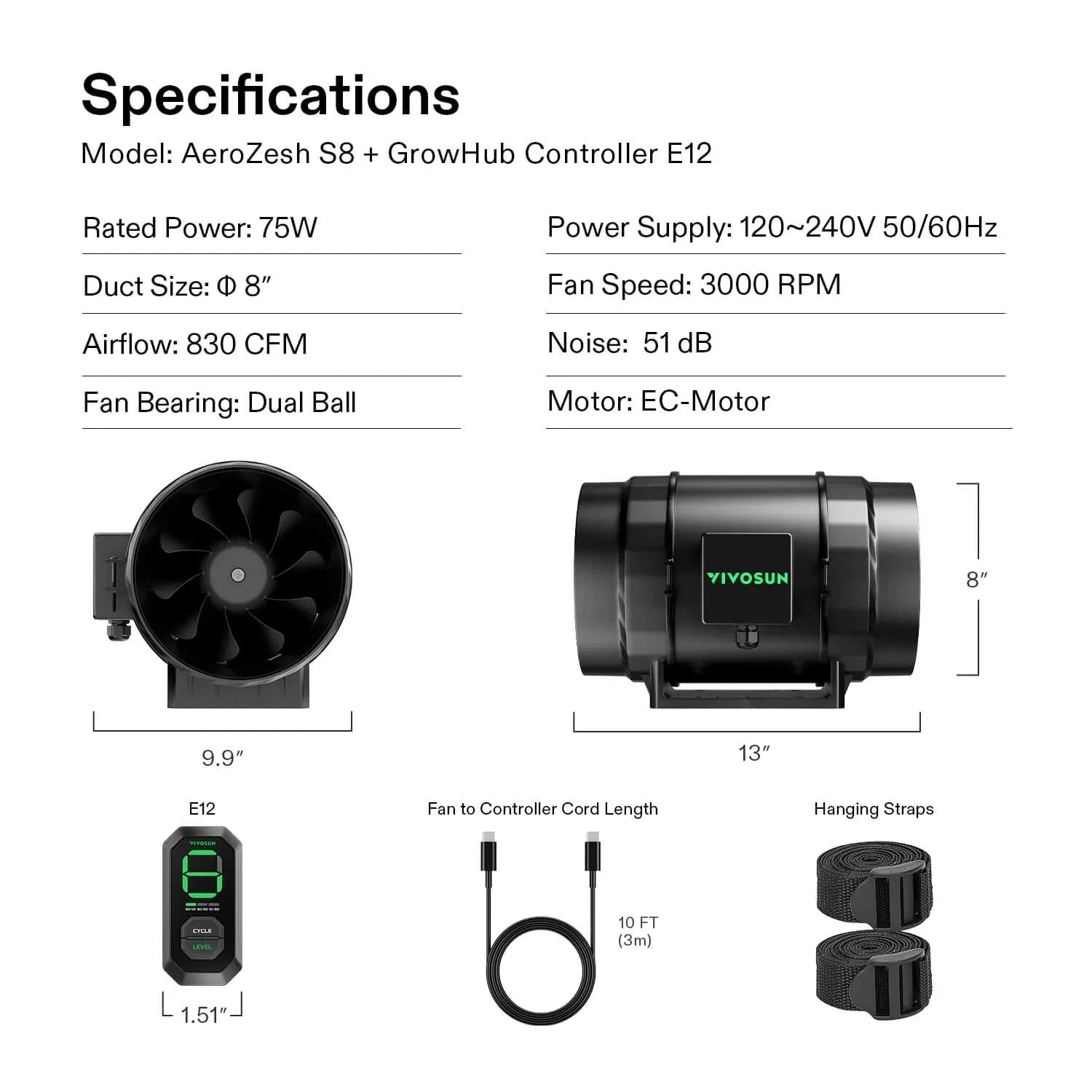 VIVOSUN AeroZesh S8 Inline Fan Specifications