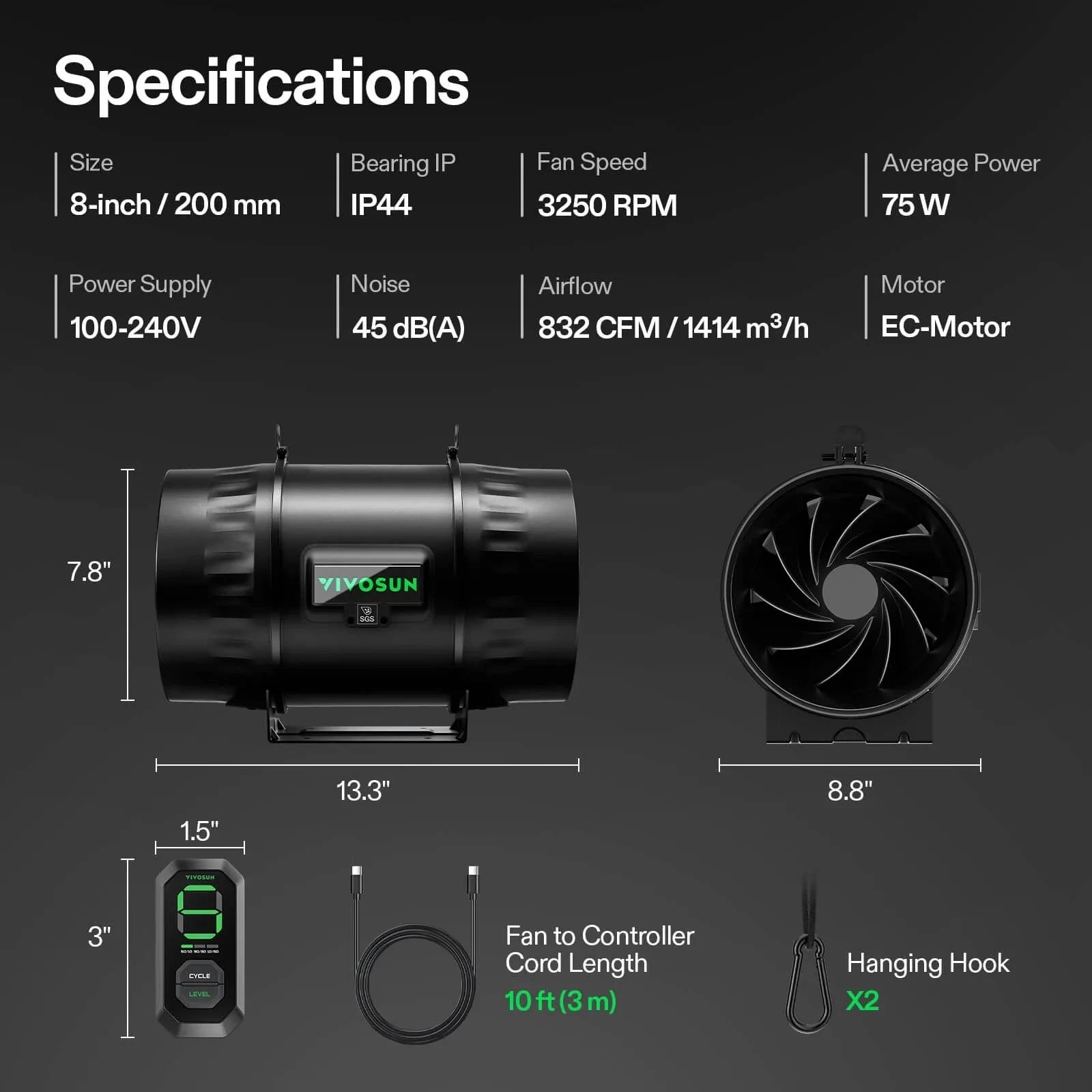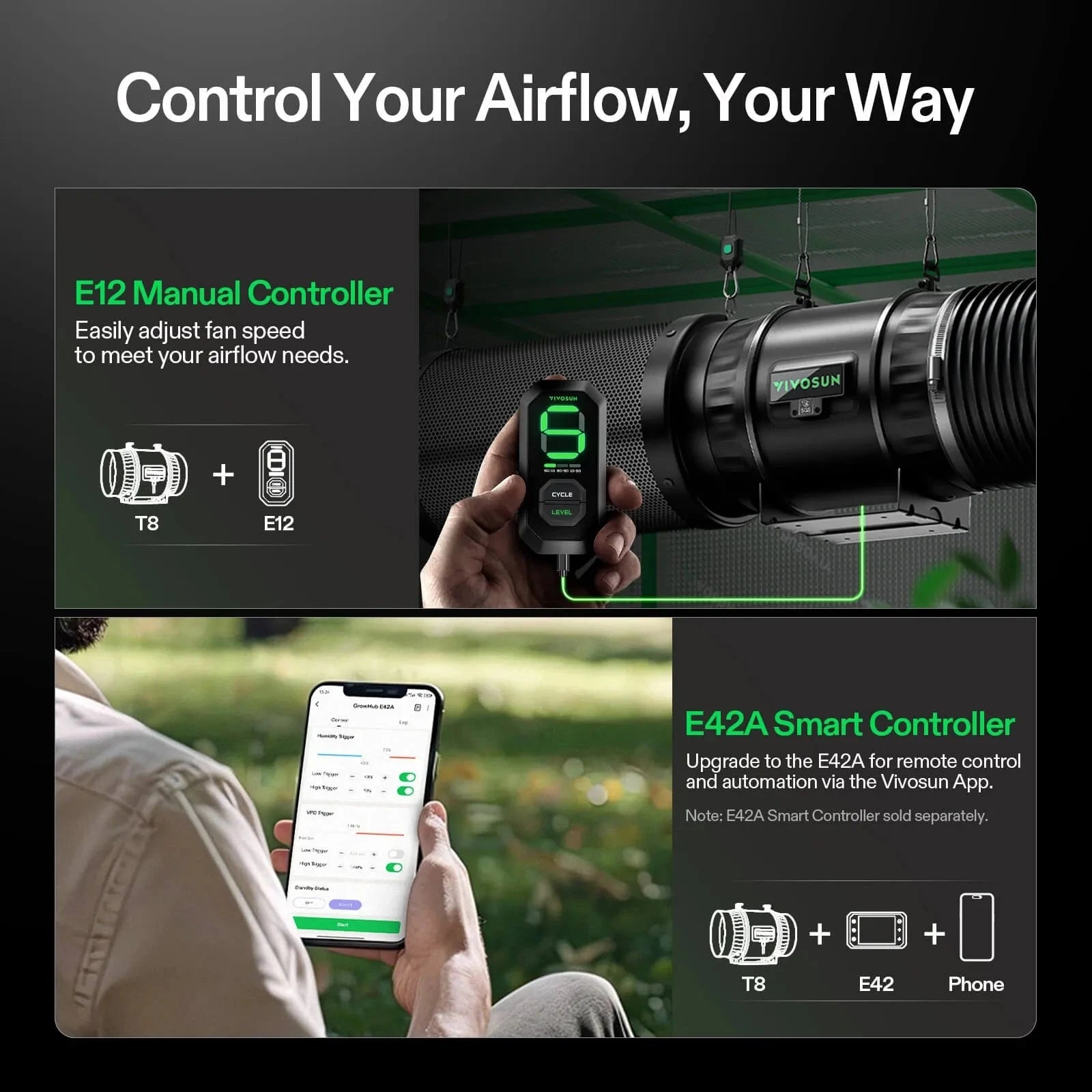 Vivosun AeroZesh T8 Inline Fan w/ E12 Speed Controller - 8" Duct