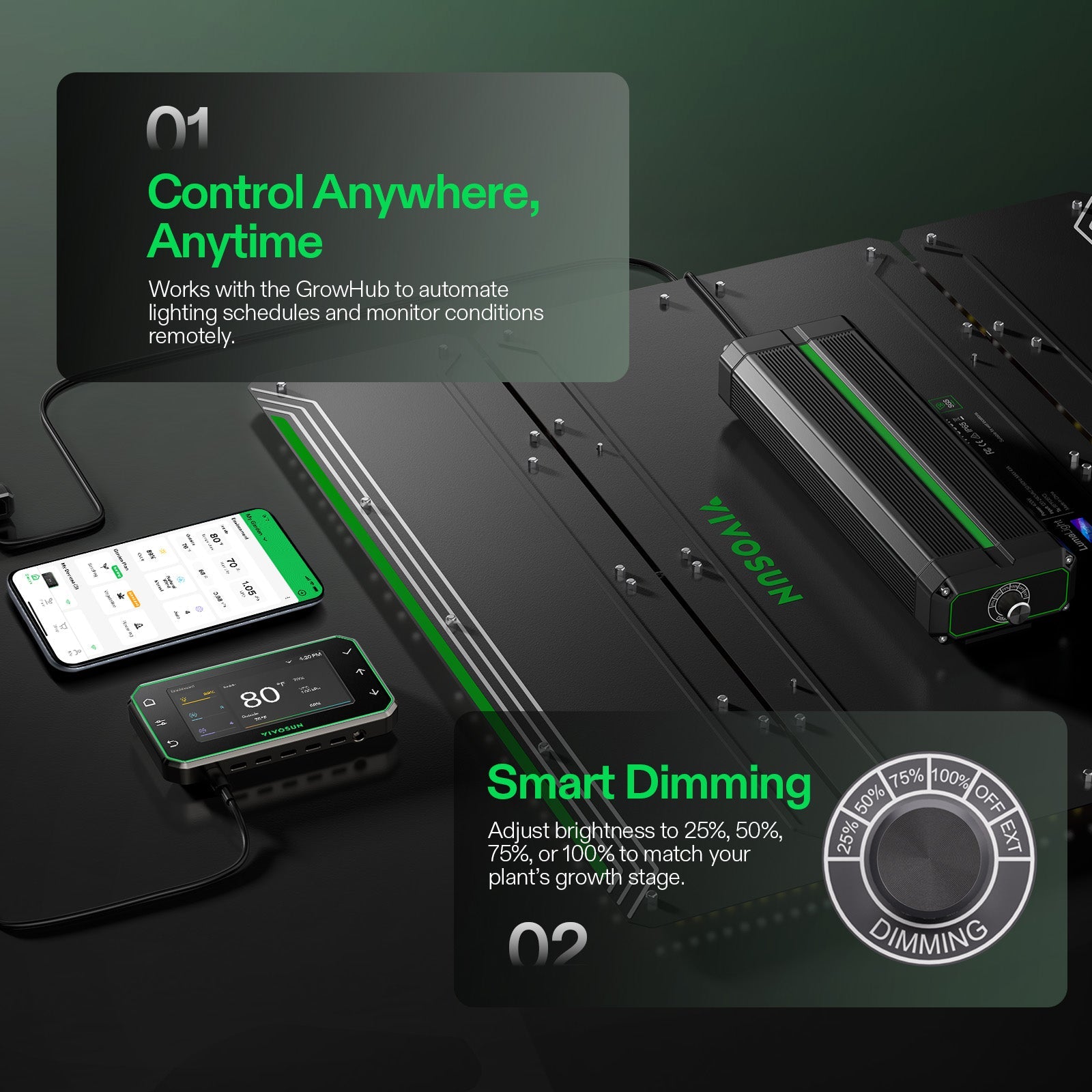 GrowHub compatible for remote monitoring, automated scheduling, and app-based dimming control from anywhere.
