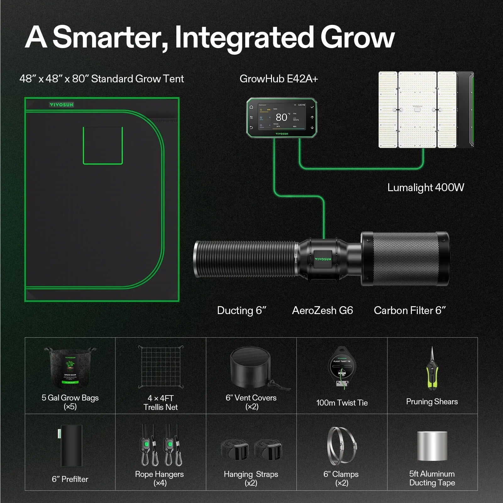 Includes 4x4 grow tent, LED grow light, ventilation system, carbon filter, grow bags, trellis net, and all accessories needed to start growing.