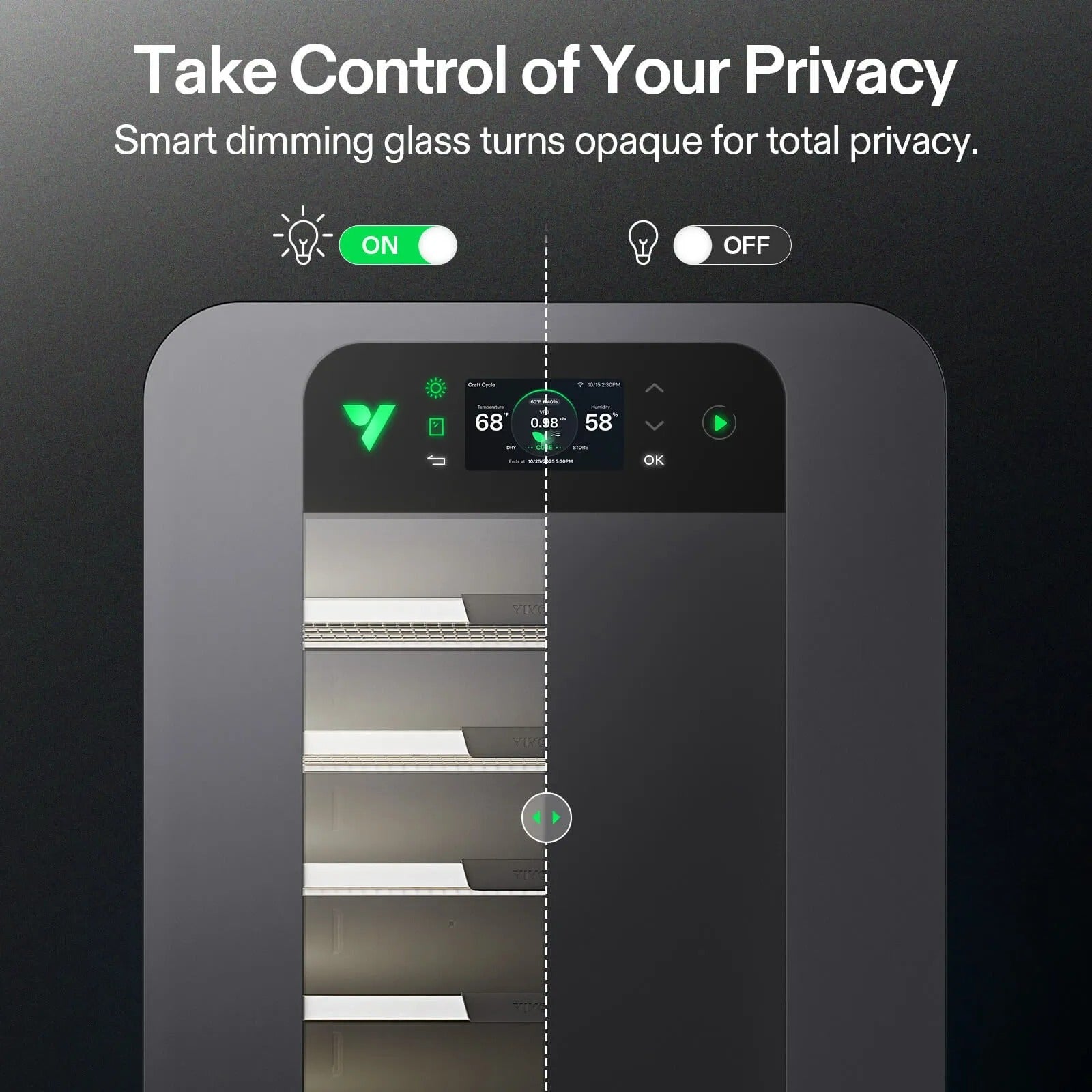 Tap the screen to toggle the glass between transparent (for inspection under 4000K LED light) and opaque (for security and privacy).